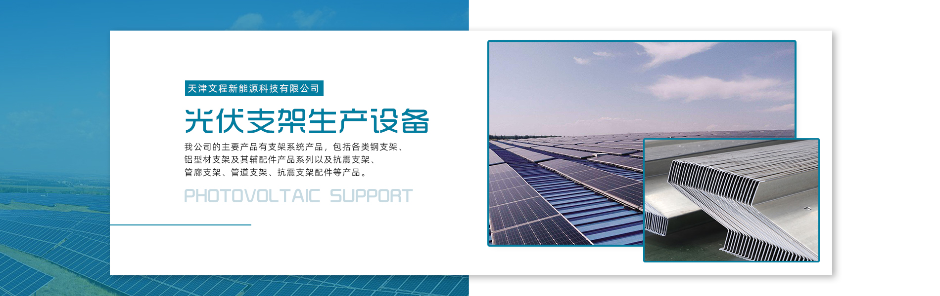 天津文程新能源科技有限公司成立于2021年,是專注于集中式、分布式、漁光互補(bǔ)和農(nóng)光互補(bǔ)等清潔能源發(fā)電的綜合性企業(yè) 公司是集設(shè)計(jì)、研發(fā)、生產(chǎn)、制造為一體的綜合型企業(yè)。公司占地面積20000平方米,注冊(cè)資金5000萬(wàn)元整。公司坐落于華北鋼鐵重鎮(zhèn)--大邱莊,距天津市區(qū)50公里、鄰104和205國(guó)道及京滬高速,交通十分便捷。 本公司擁有三個(gè)生產(chǎn)車(chē)間,其中兩個(gè)冷彎型鋼車(chē)間,一個(gè)鋅鋁鎂型鋼車(chē)間,擁有自動(dòng)冷彎成型機(jī)10條,自動(dòng)數(shù)控沖孔機(jī)10條以及焊接加工等設(shè)備。主要生產(chǎn)產(chǎn)品有:太陽(yáng)能光伏支架、各種規(guī)格的C/Z/U型鋼、抗震支架、管廊支架及整套配件等。